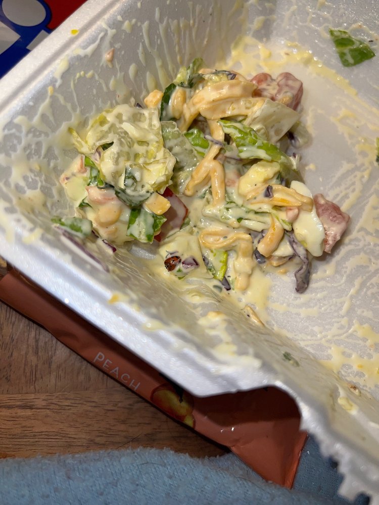 Fresh greens, cheddar cheese, tomato, eggs and croutons..